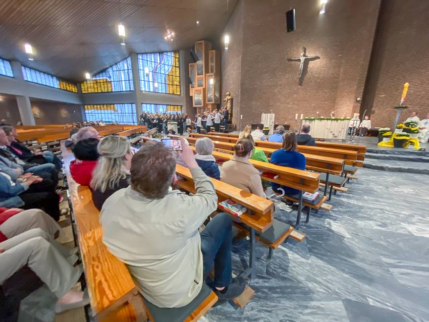 Die Jugendlichen brachten ihre Verbundenheit in den Fürbitten zum Ausdruck. Sie wünschten ihm Gottes Segen für den neuen Weg. Was dann folgte, traf viele im Raum spürbar: Nach der Kommunion versammelte sich ein großer Gruppenleiter-Chor vor der Orgel. Gruppenleiterinnen und Gruppenleiter aus dem Jugendzentrum, dem JCH, den Messdienern sowie den Mädchen- und Jungenzeltlagern hatten ein Lied vorbereitet. Eine umgedichtete Version der bekannten Werder-Bremen-Hymne – persönlich, direkt und voller Erinnerungen.